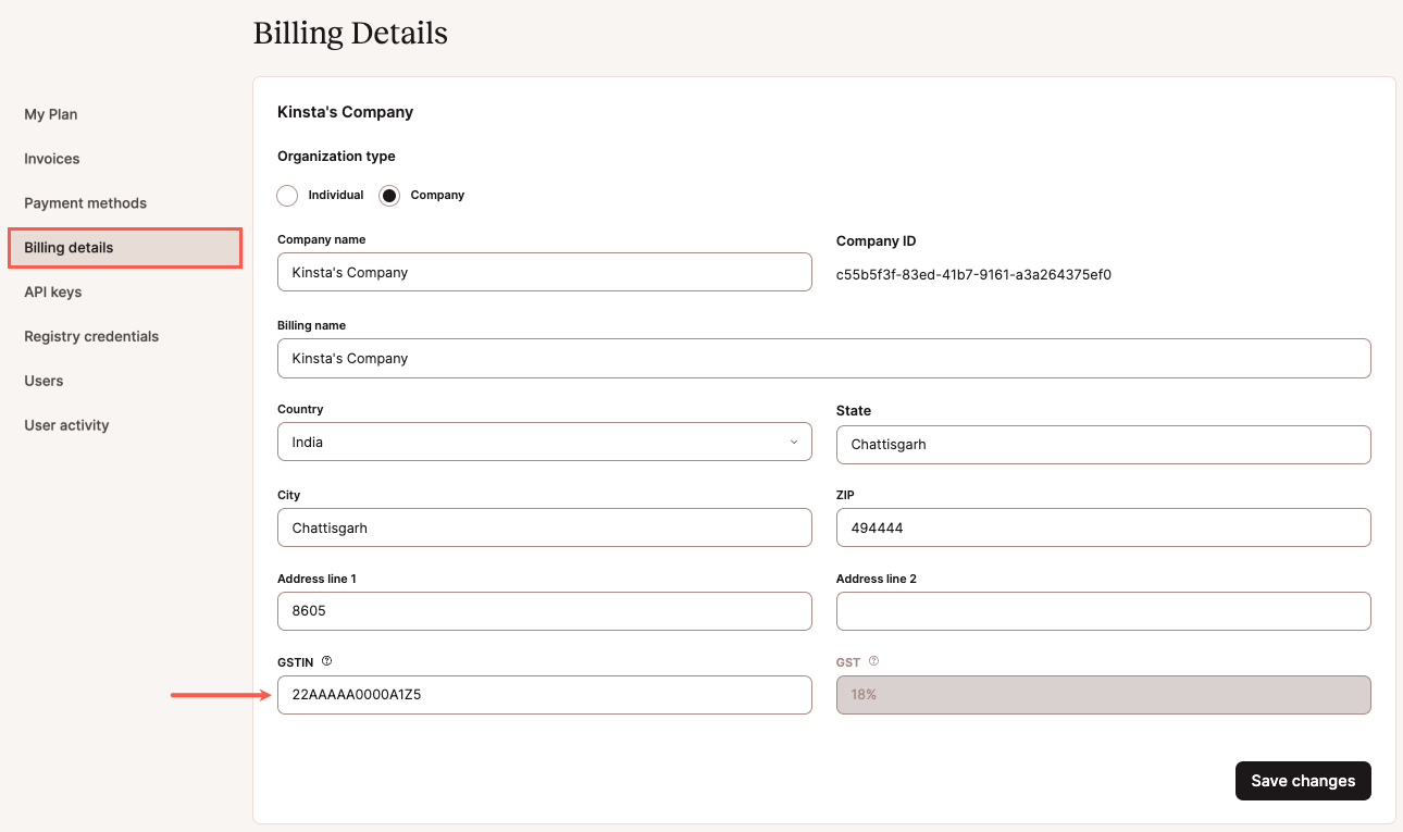 You may add your GSTIN at any time within Sevalla, go to username > Company settings > Billing Details. Enter your number in the GSTIN field and click Save changes. Your GSTIN will be validated and will only be accepted if its format is valid and active. To be considered valid, the GSTIN must be from the same state shown in your billing address.